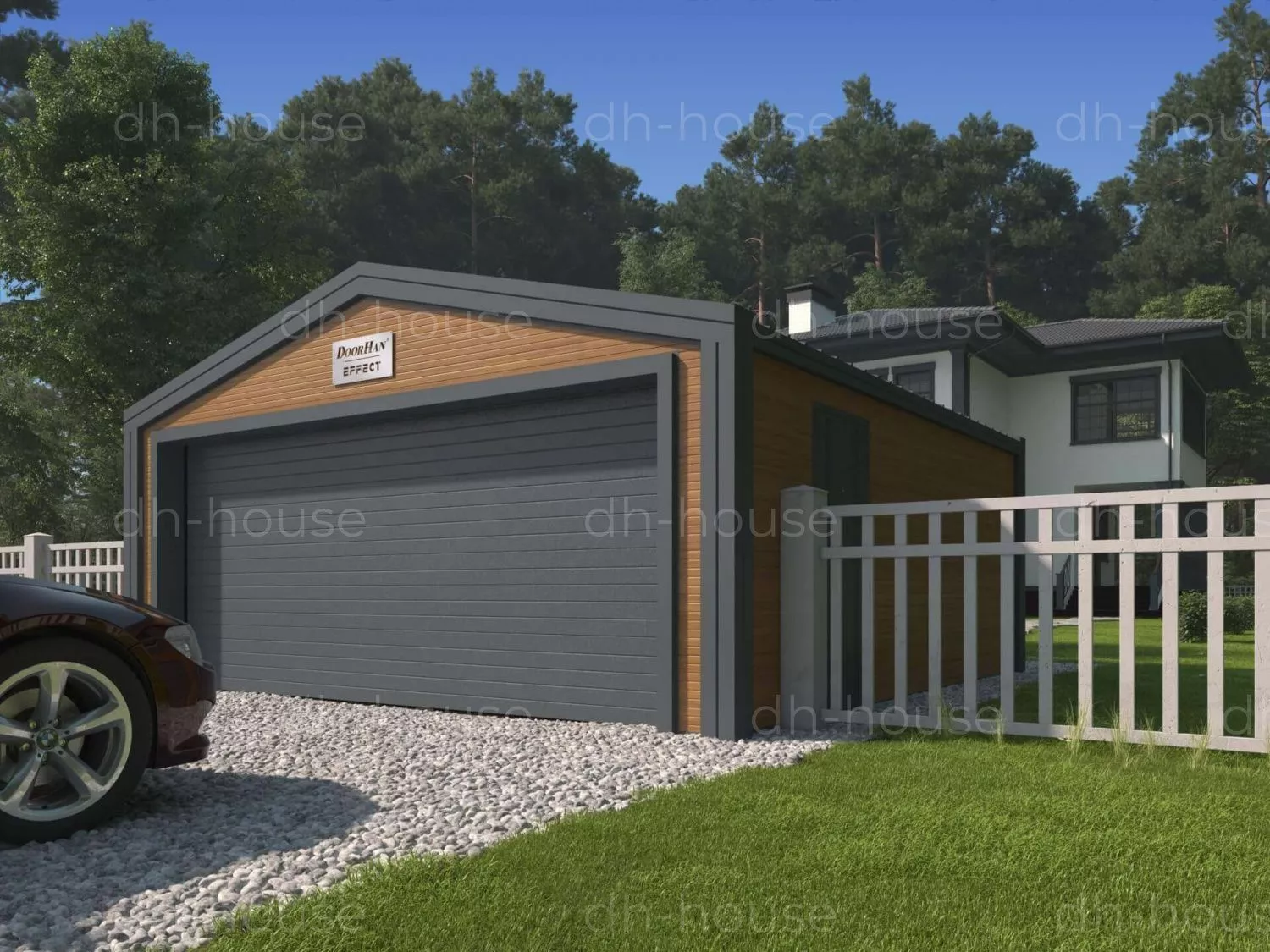 Гараж DoorHan представляет собой двускатное строение для стоянки автомобиля в Кирове. Выполнен в виде прямоугольной конструкции. Несущую функцию выполняет металлический каркас, собранный из профиля С-образной формы с оцинкованной поверхностью. Для обшивки кровли и стен выбраны PIR-панели. Цвета внешних стеновых панелей — золотой дуб, кровельных уличных панелей — RAL 7016, стен и кровли внутри — RAL 9003.